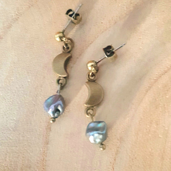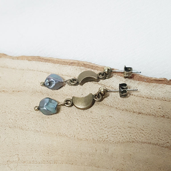 Retro oorbellen met bronskleurige maantjes en prachtige grijsblauwe brokjes zoetwater parel. De parels hebben een mooie natuurlijke parelmoerglans.